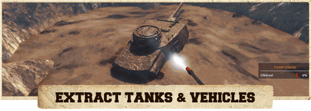 • 从地下使用特殊工具挖掘坦克:金属探测仪,地面雷达,无人机…找到坦克所在的位置,用探测器标记坦克,呼叫挖掘队,清洁坦克,并将坦克装车。